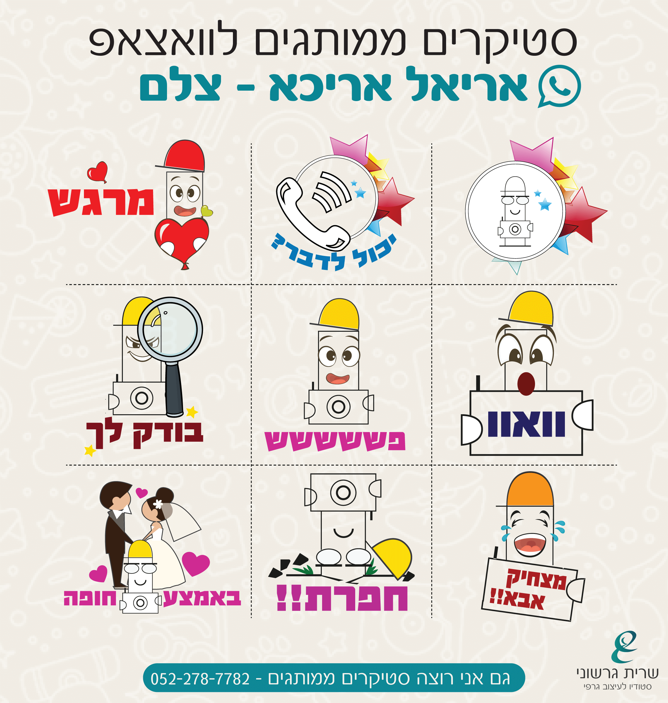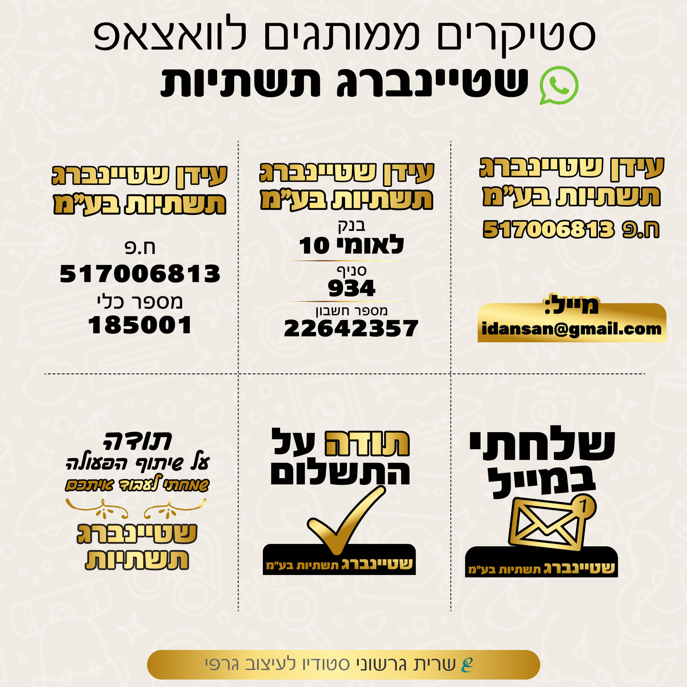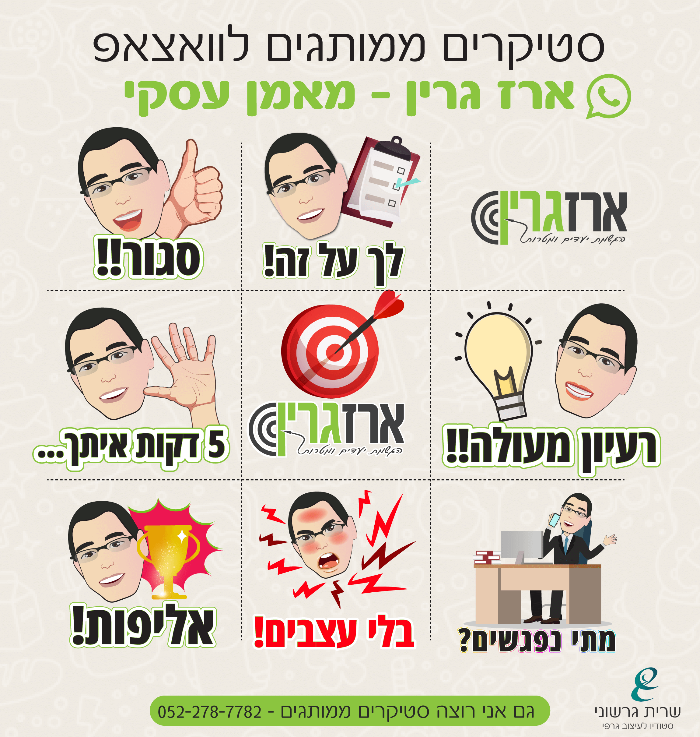 סטיקרים ממותגים בסגנון של הלוגו, הצבעים של המותג שלכם יתנו שייכות ישירה וקשר לעסק שלכם. כל חבילת סטיקרים מגיעה עם קישור ישיר להורדה, כך שתוכלו לשלוח את הקישור לכל הצוות העסקי להורדה ישירה למכשיר הנייד. בלחיצה על הסטיקר עצמו יראו הפרטים של העסק שלכם, ובעצם שליחתם מהווה פרסום משתרשר עבורכם.